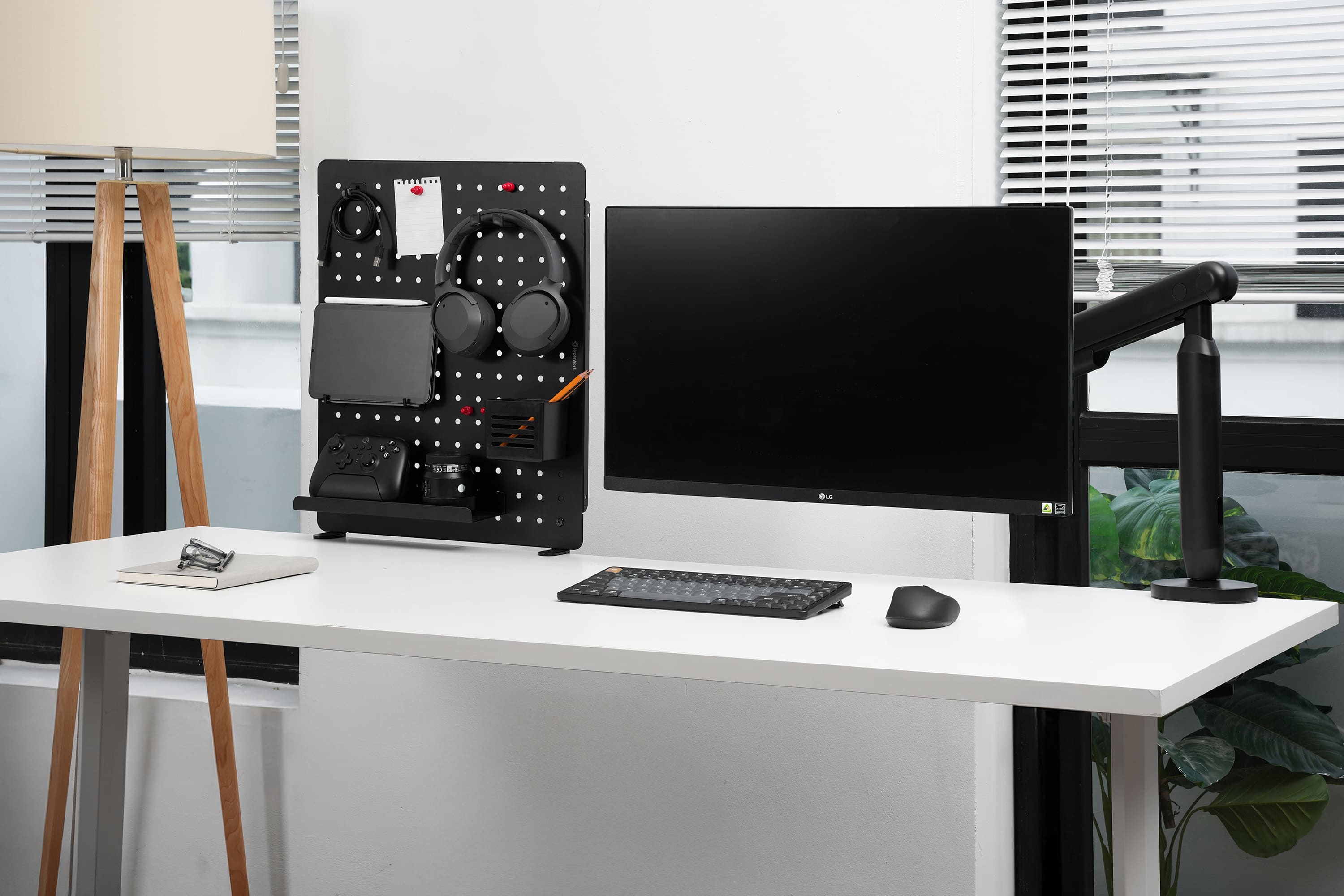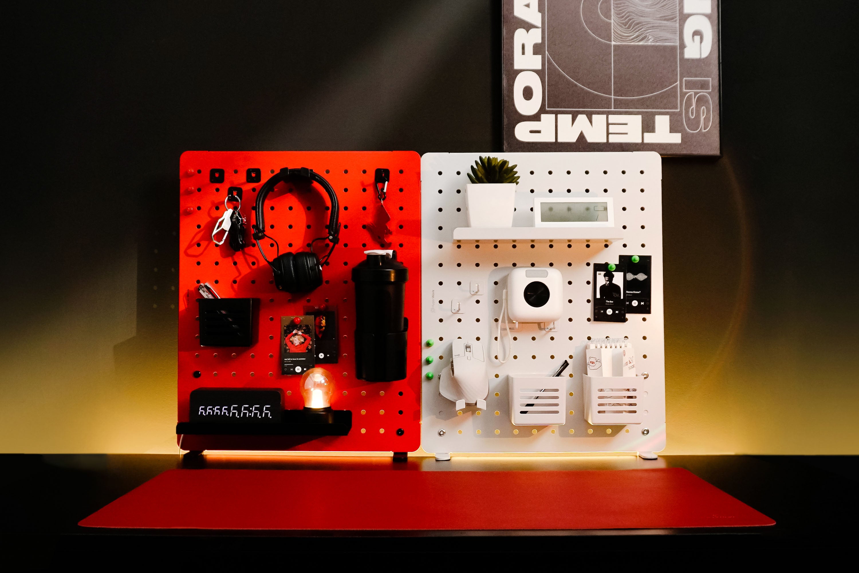 Like cabinets or drawers, a pegboard is an effective storage solution. But beyond that, a pegboard is the perfect tool for setup enthusiasts to creatively transform it into a highly personalized item, from the way accessories are displayed to creating a visual highlight.