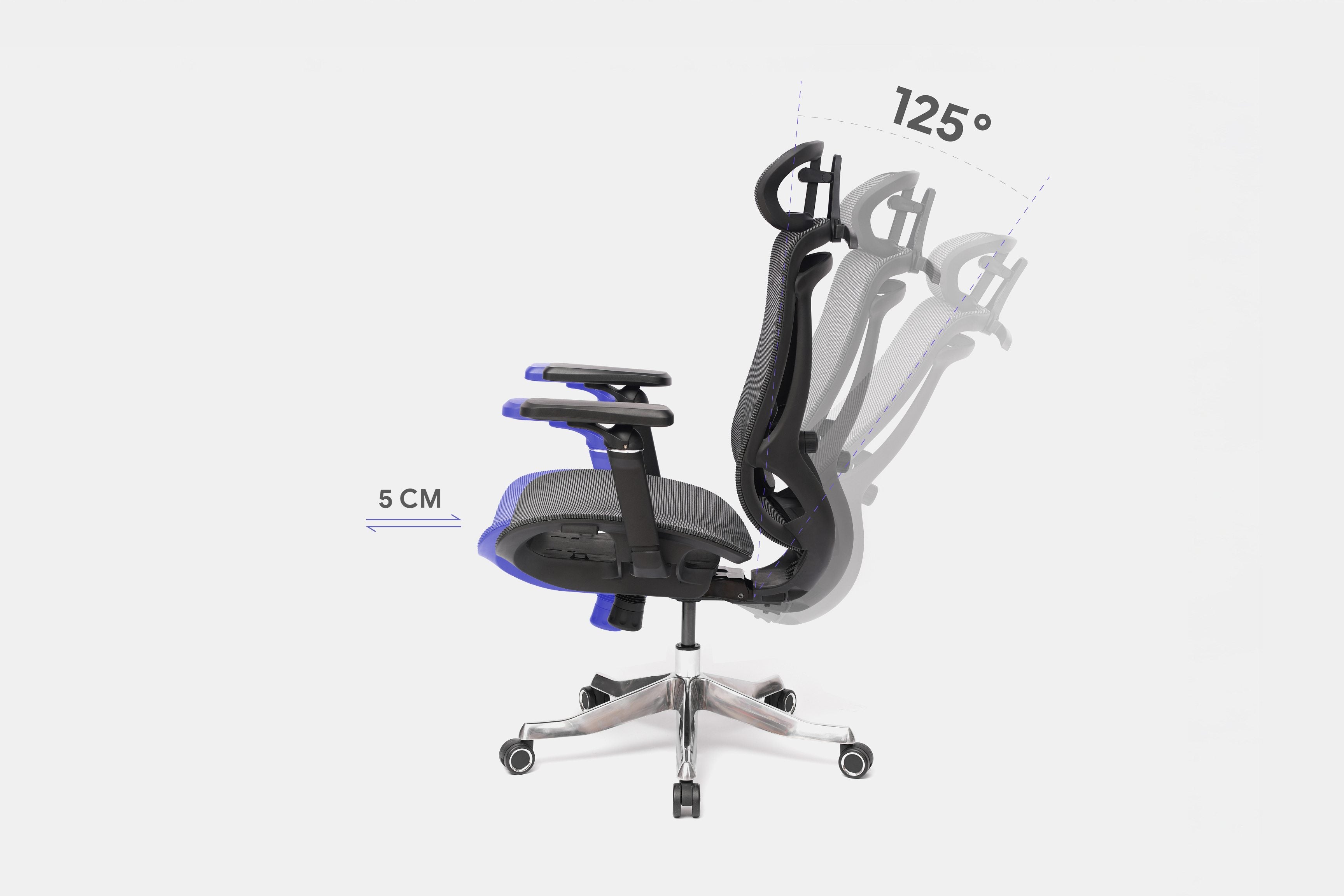 Airy Pro có thể ngả lưng ở 3 vị trí, tối đa 125 độ và trượt mâm ghế 5 cm.