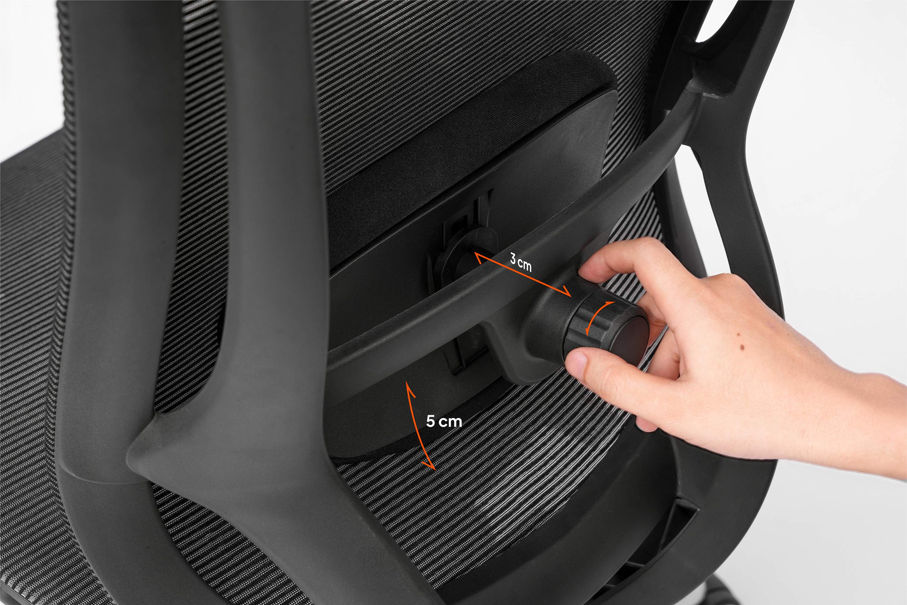 - Tựa lưng 2D Lumbar Support dạng núm xoay, thay đổi độ cao và độ chùng/căng của lưới
