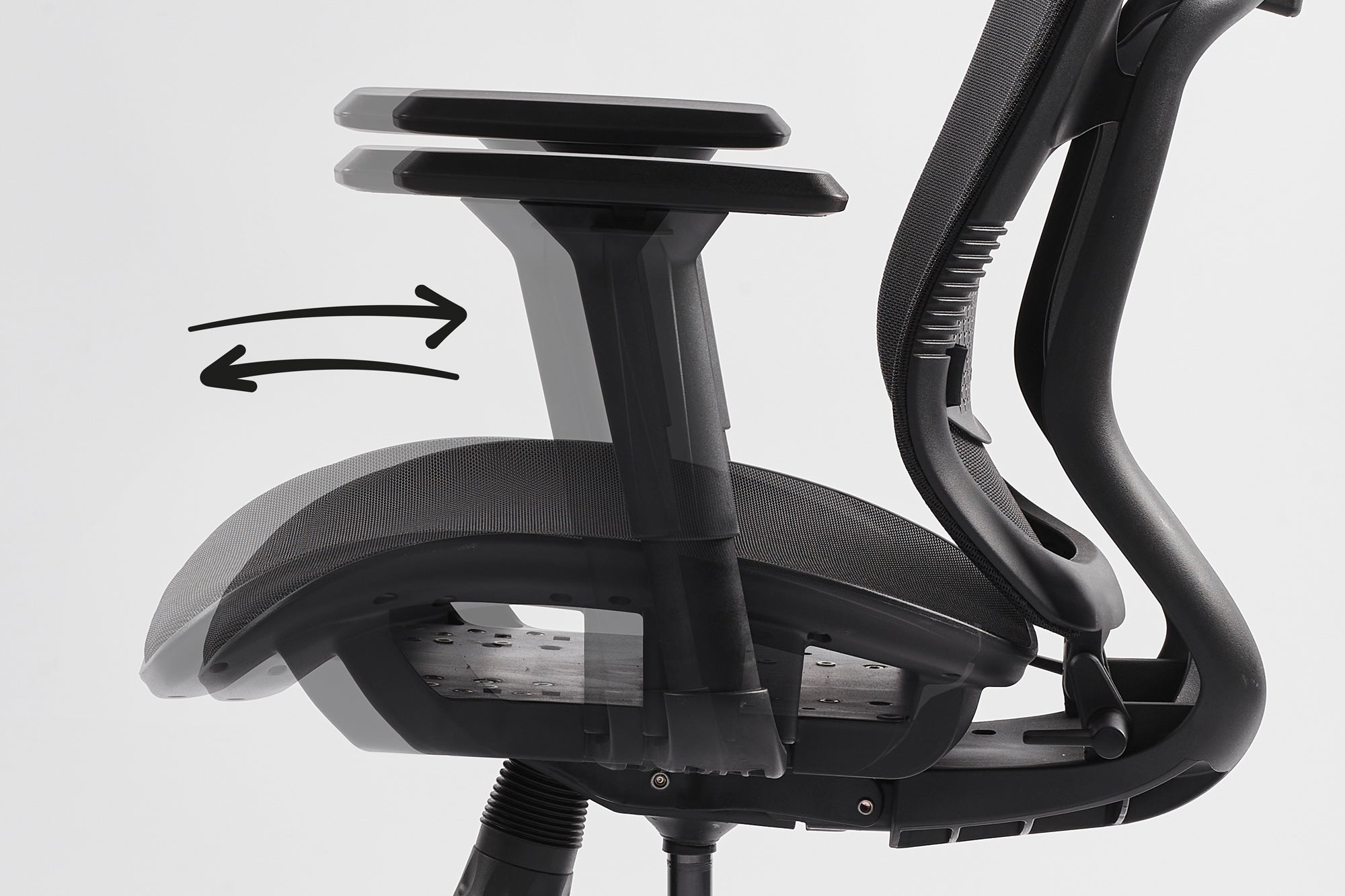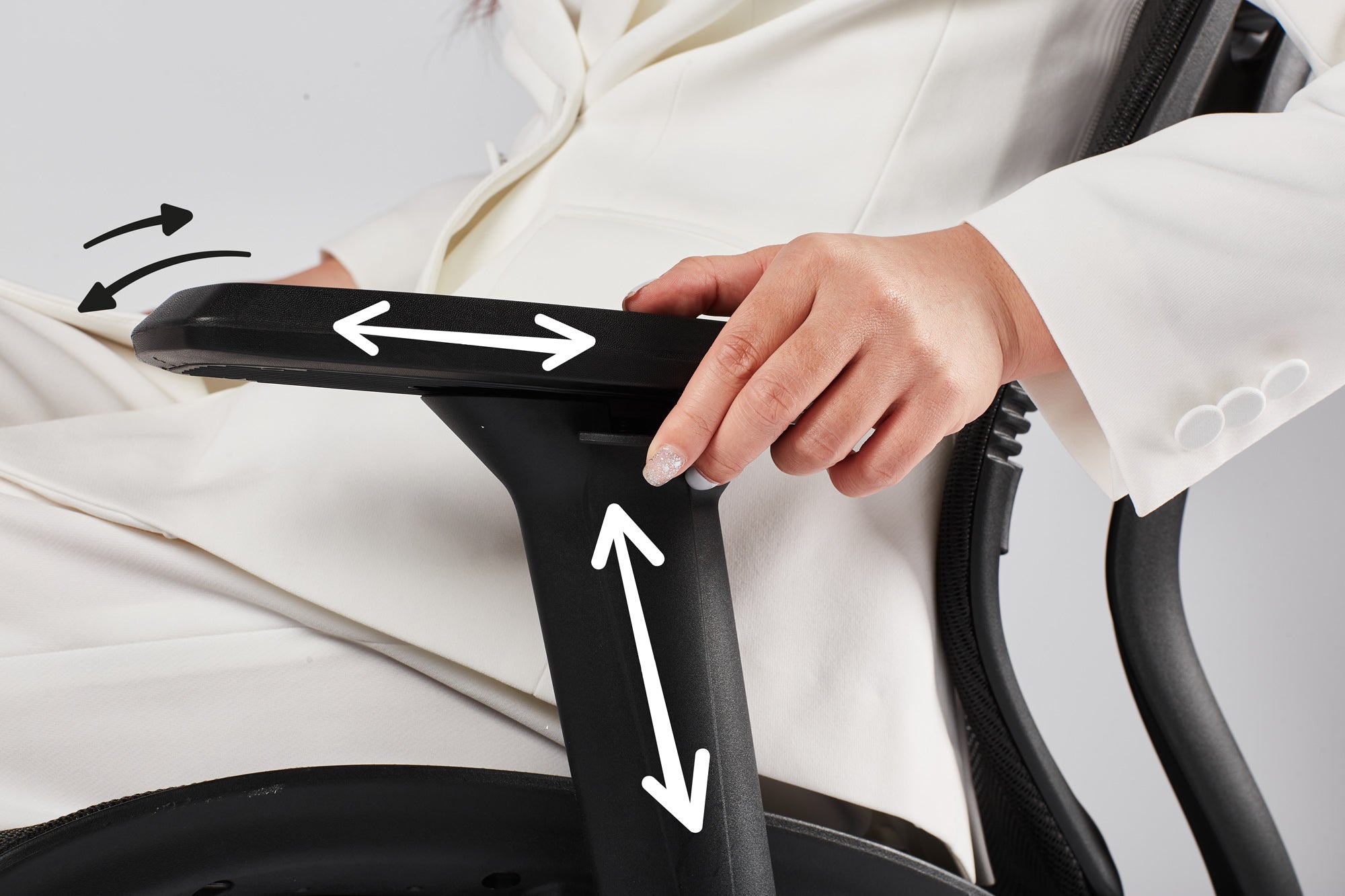 Tay ghế 3D có thể chỉnh được độ cao, và xoay được phần đầu tay ghế qua trái phải, đẩy tới và lui phần đệm tay sao cho vừa vặn nhất