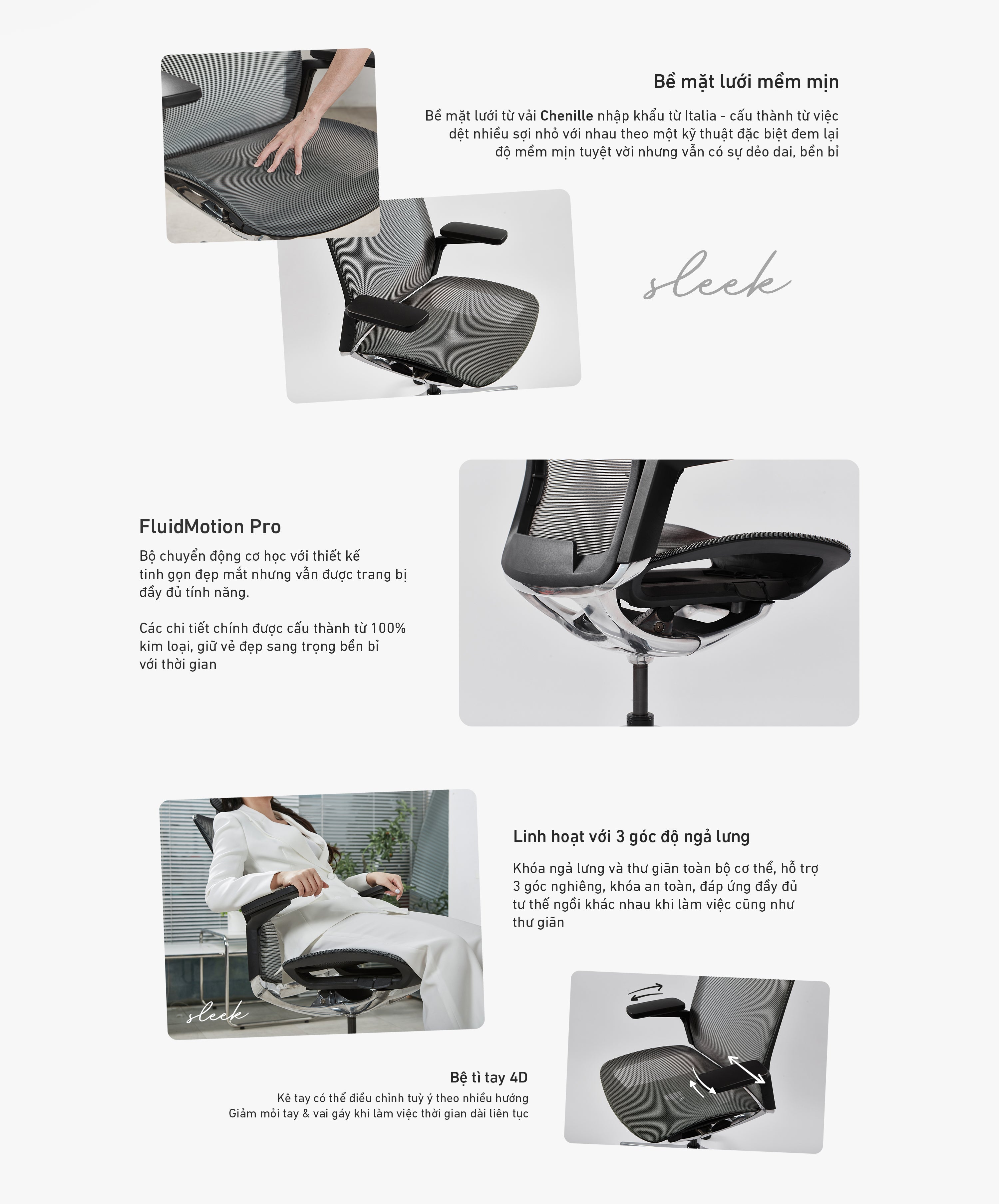 Đầy đủ chức năng công thái học trong 1 thiết kế tối giản mà sang trọng. Đáp ứng nhiều yêu cầu sử dụng chức năng khác nhau. Sleek là chiếc ghế phù hợp với mọi môi trường văn phòng.