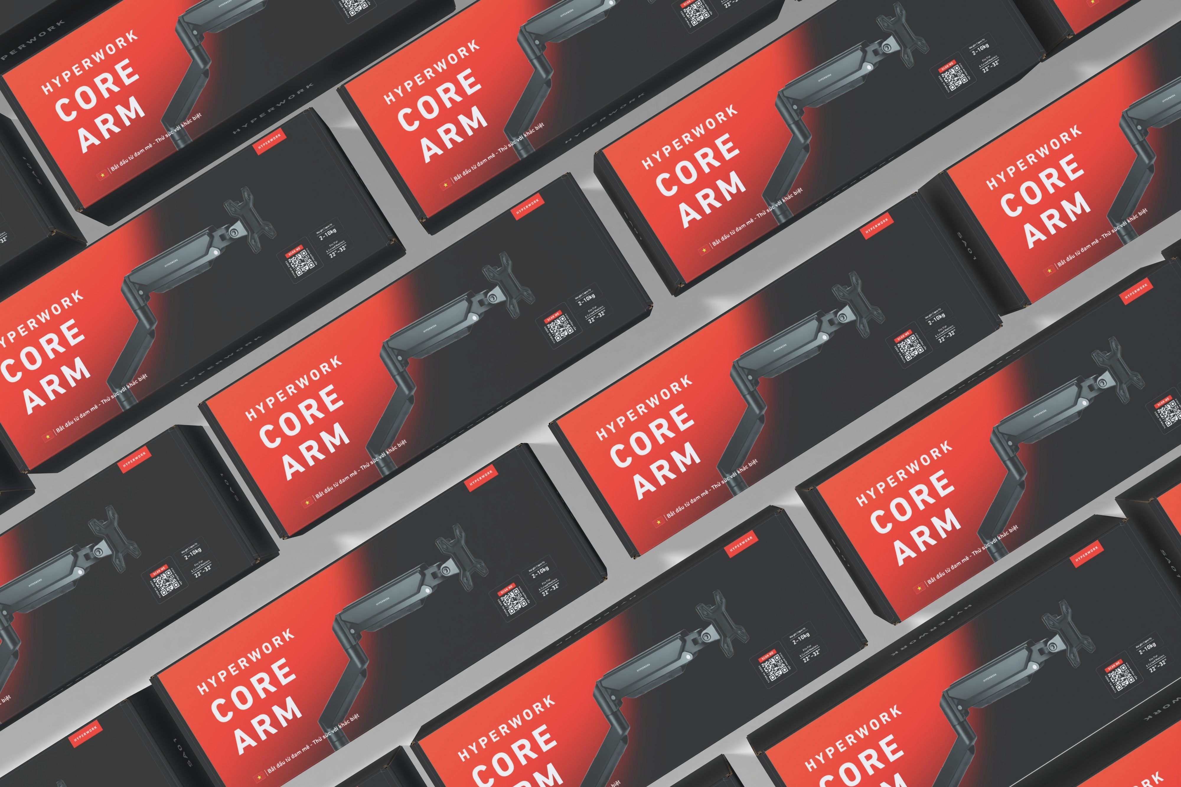 Sản phẩm HyperWork Core Arm được đặt trong hộp carton cứng 20 × 150 × 10 mm, in tông màu đen–đỏ đặc trưng. Bao bì gọn gàng, an toàn khi vận chuyển và mang lại trải nghiệm mở hộp chuyên nghiệp.