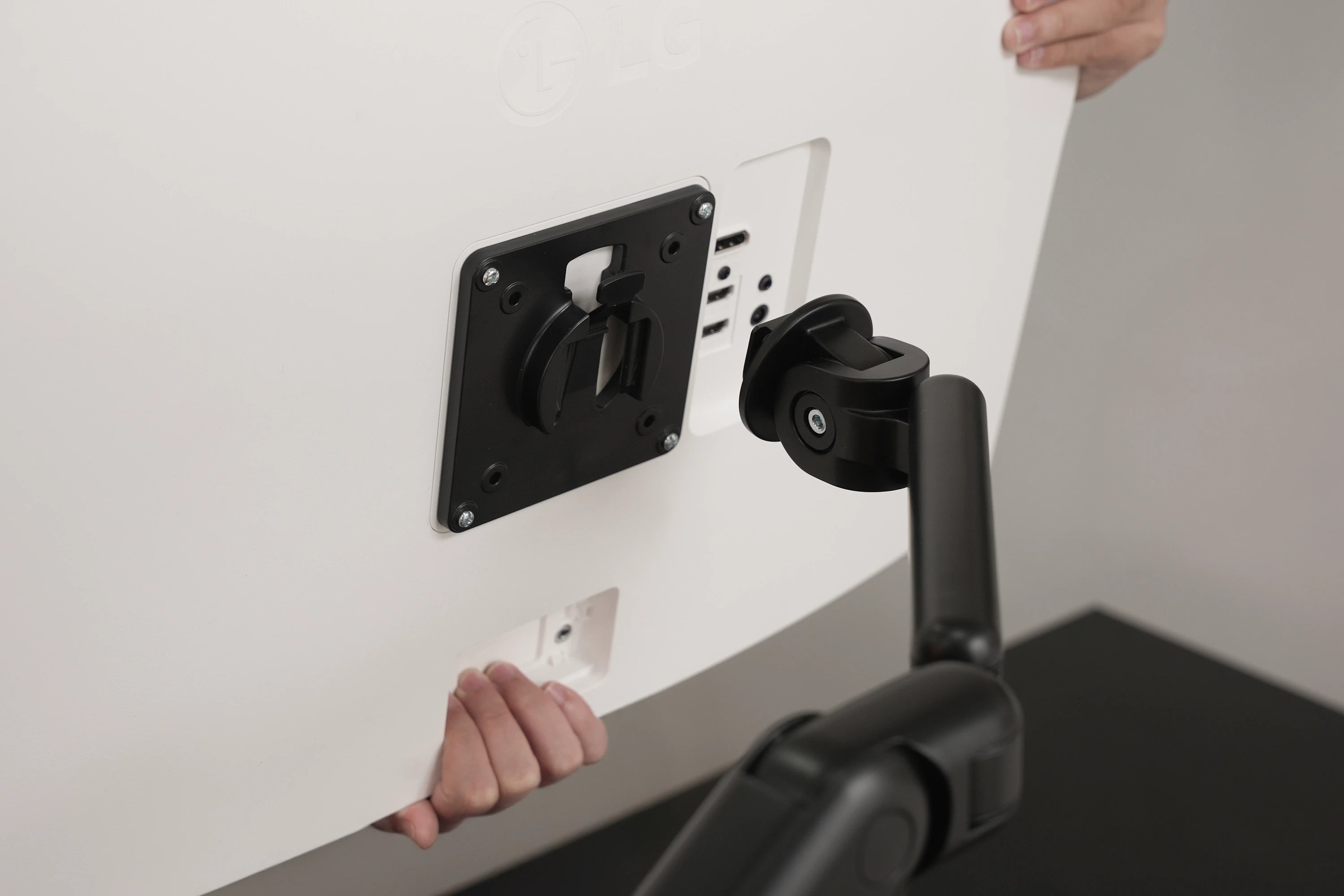 - Cơ chế Quick Release Vesa và điều chỉnh kháng lực, hỗ trợ lắp đặt, điều chỉnh màn dễ dàng hơn
