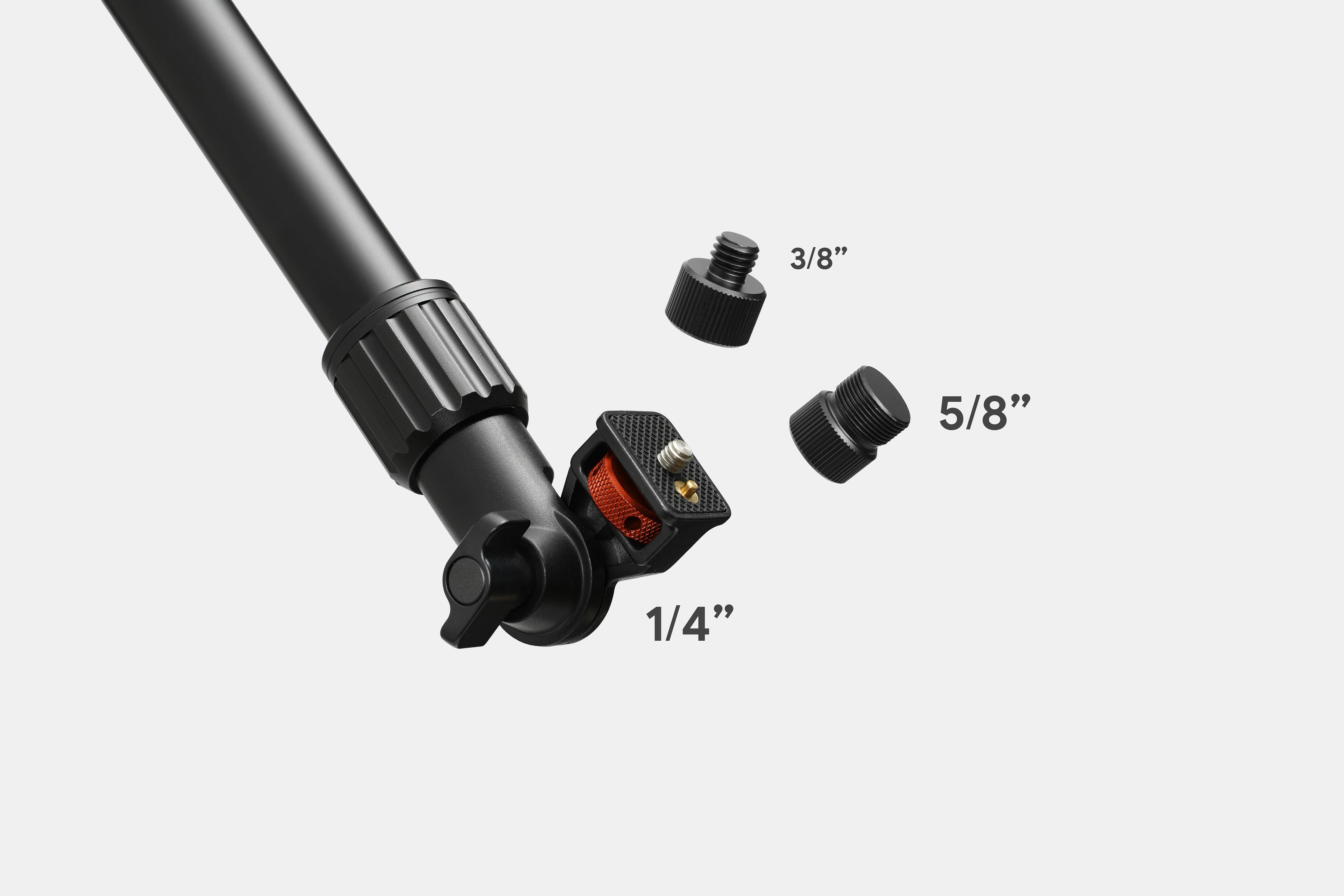 - Mount 1/4" cố định, bổ sung adapter mở rộng 3/8" và 5/8", hỗ trợ nhiều thiết bị hiện đại, chuyên nghiệp
