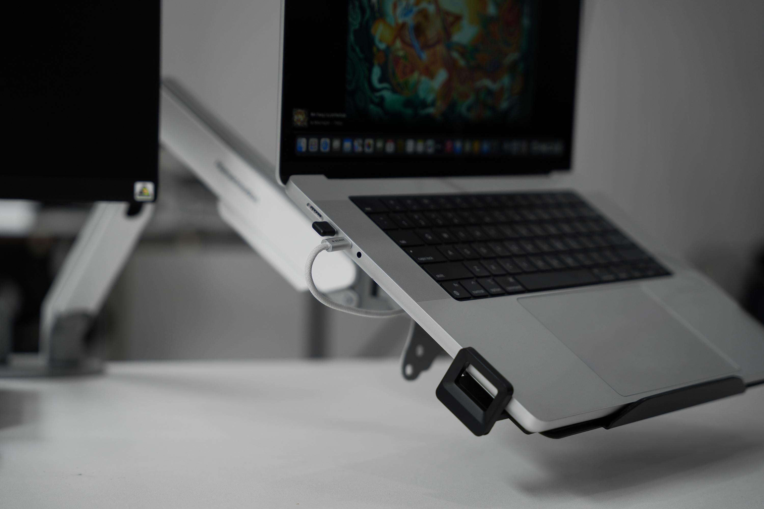Cầm đầm tay, chắc chắn, LT03 nâng đỡ an toàn cho laptop, tablet. Lưu ý: Thao tác lắp đặt cần đảm bảo siết ốc chắc chắn vào ngàm VESA của arm màn hình.