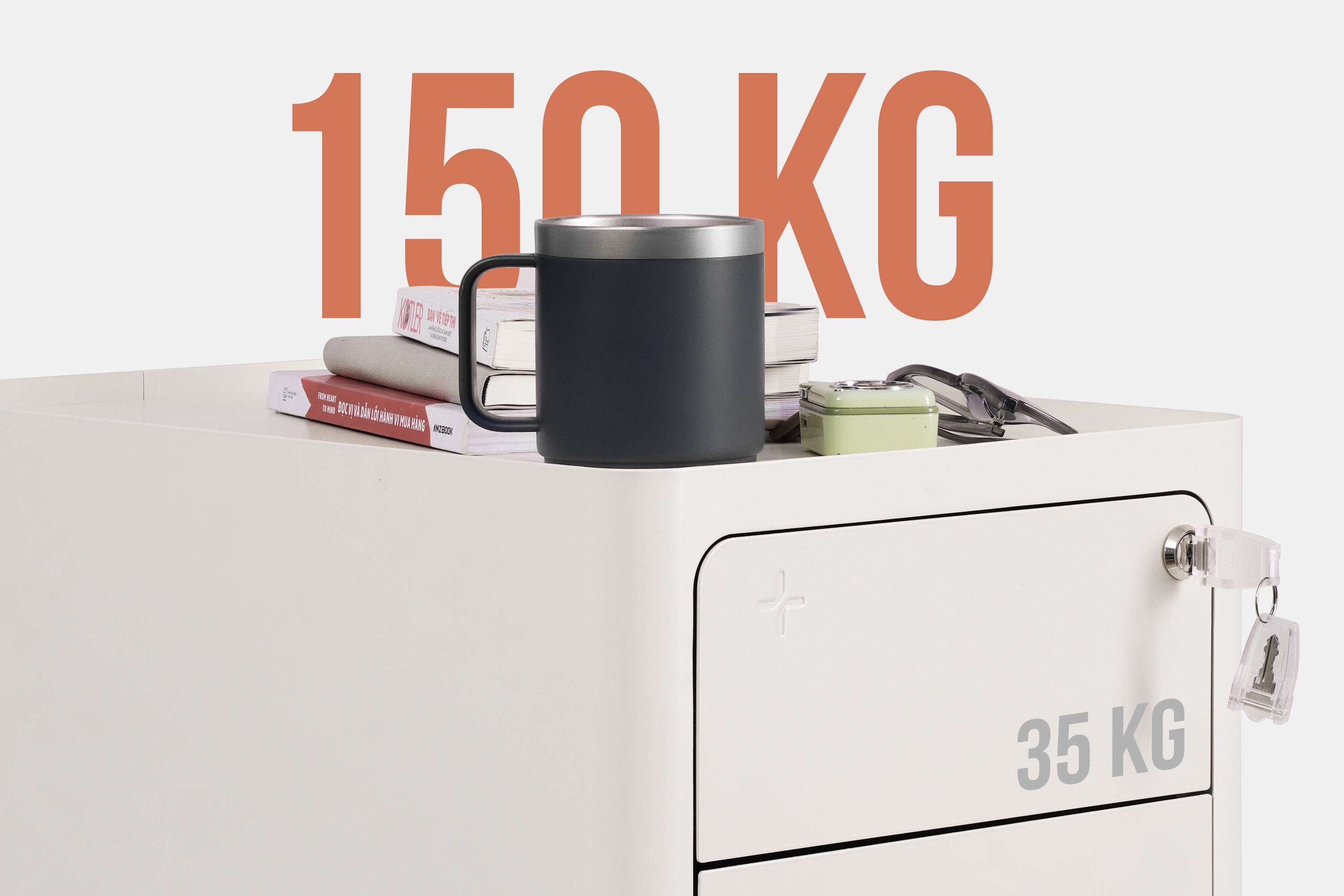 Ngăn tủ chịu tải lên đến 35 kg, cho phép đặt laptop, tài liệu dày hoặc phụ kiện nặng, trong khi phần nóc chịu tải tới 150 kg, đủ vững chắc để ngồi khi làm việc hoặc trao đổi nhanh.